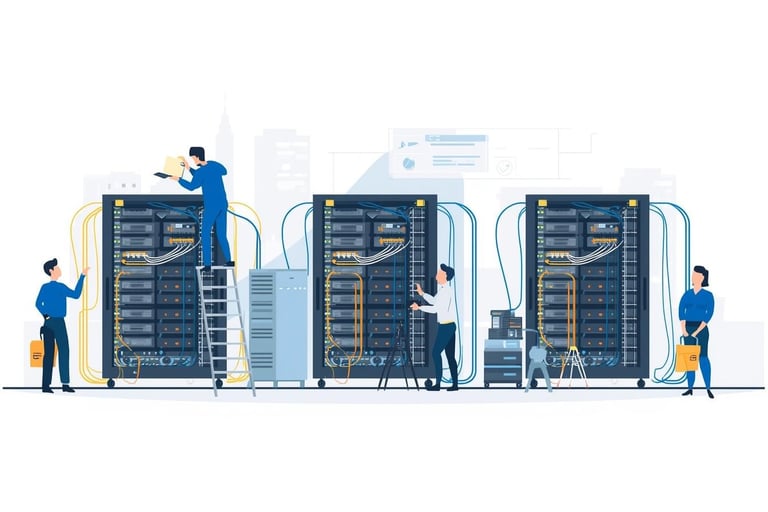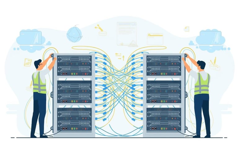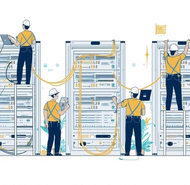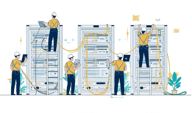 Instalação profissional de cabos, pontos de rede e racks organizados.